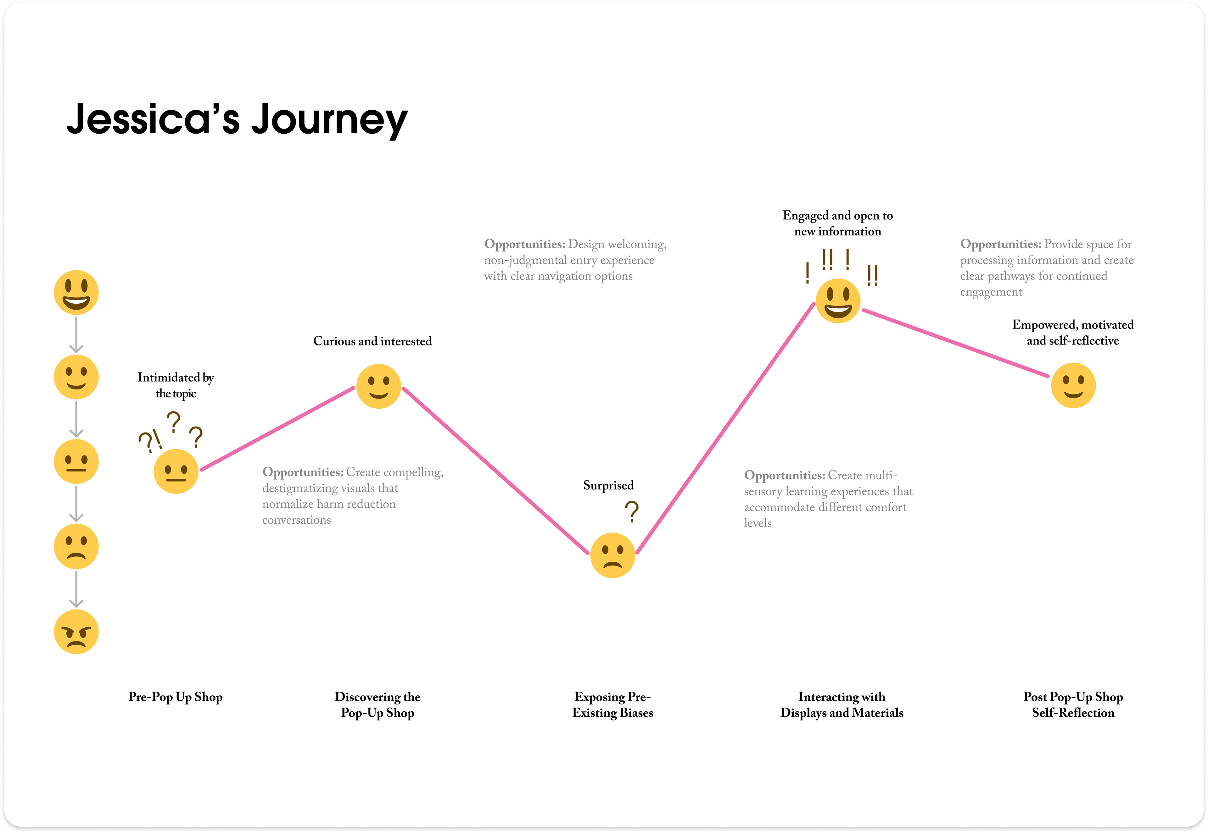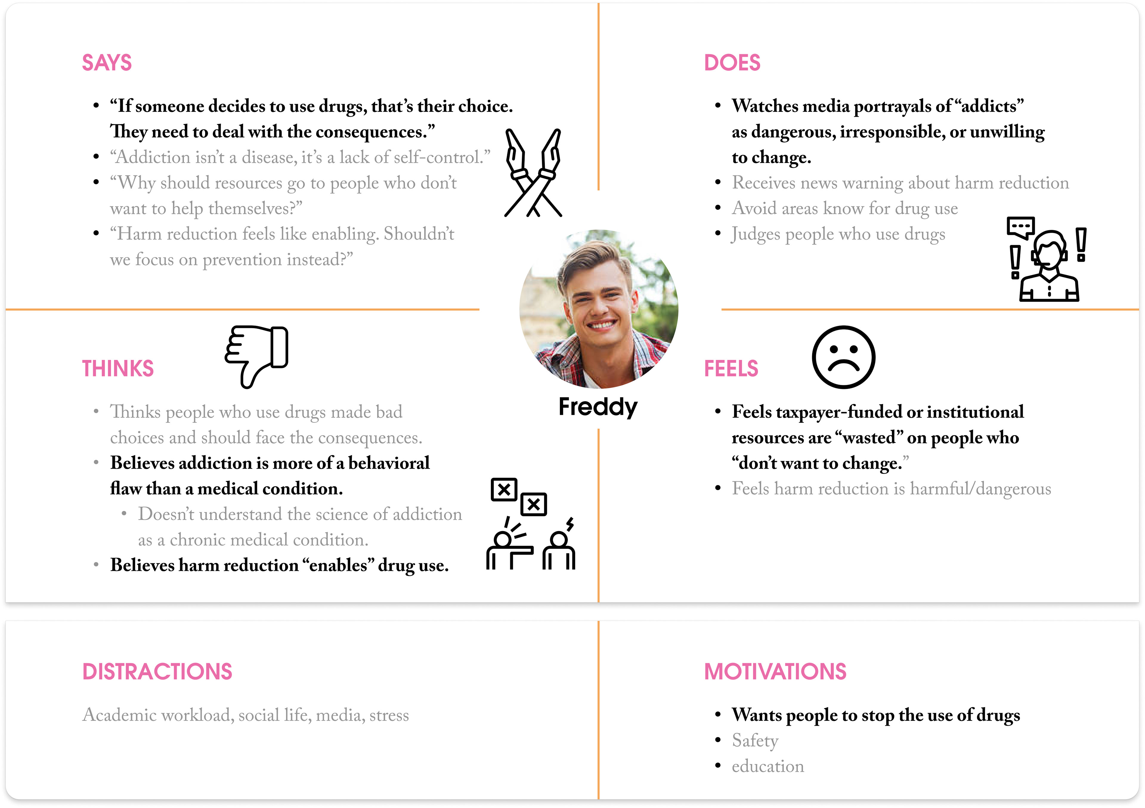 To understand our diverse student audience, we developed three personas representing a spectrum of perspectives on substance use and harm reduction— from supportive advocates to skeptical opponents. Each persona helped us identify specific design opportunities throughout the user journey.