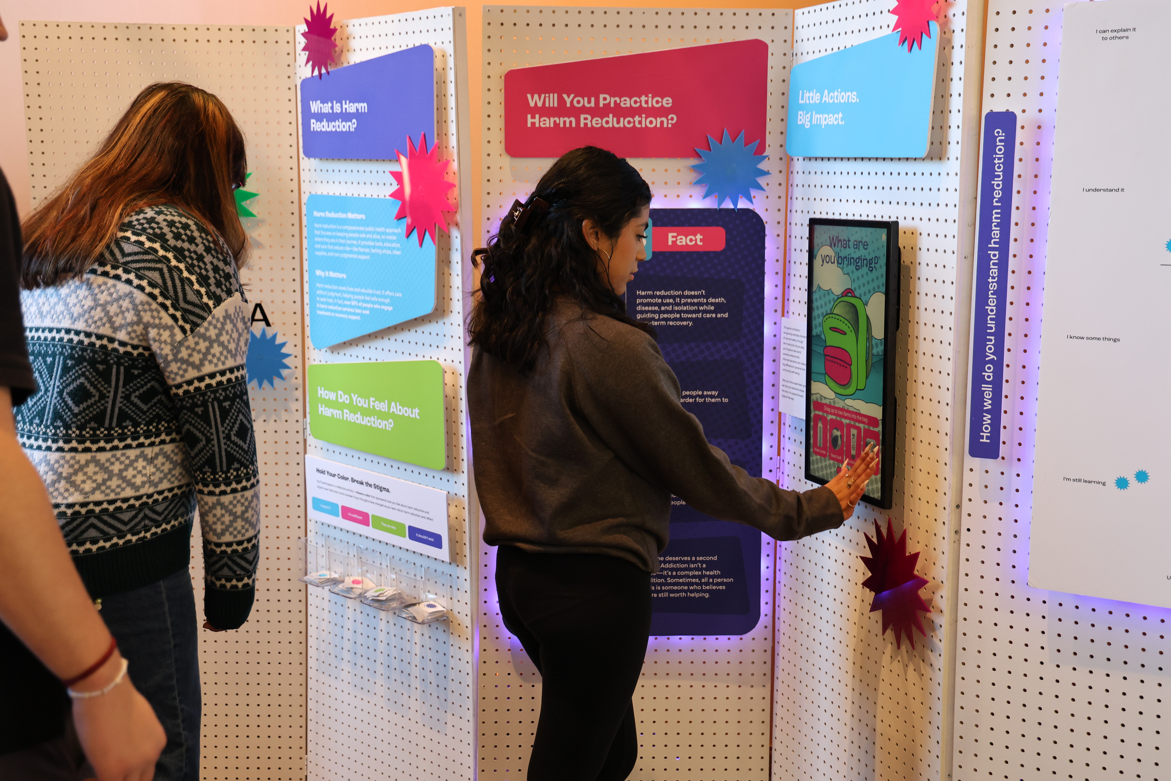 Through our visit to The Everywhere Project, we gained crucial insights that shaped our design approach. We learned that 80% of overdoses occur in the home, and clean supplies increase the likelihood of seeking treatment by 4×, highlighting the need for accessible education and resources in everyday spaces. Most importantly, we observed that positive, approachable materials combat stigma far more effectively than intimidating ones. During our visit, we also assembled safe use kits containing harm reduction supplies for distribution in Philadelphia, connecting our design work directly to community-based practice.